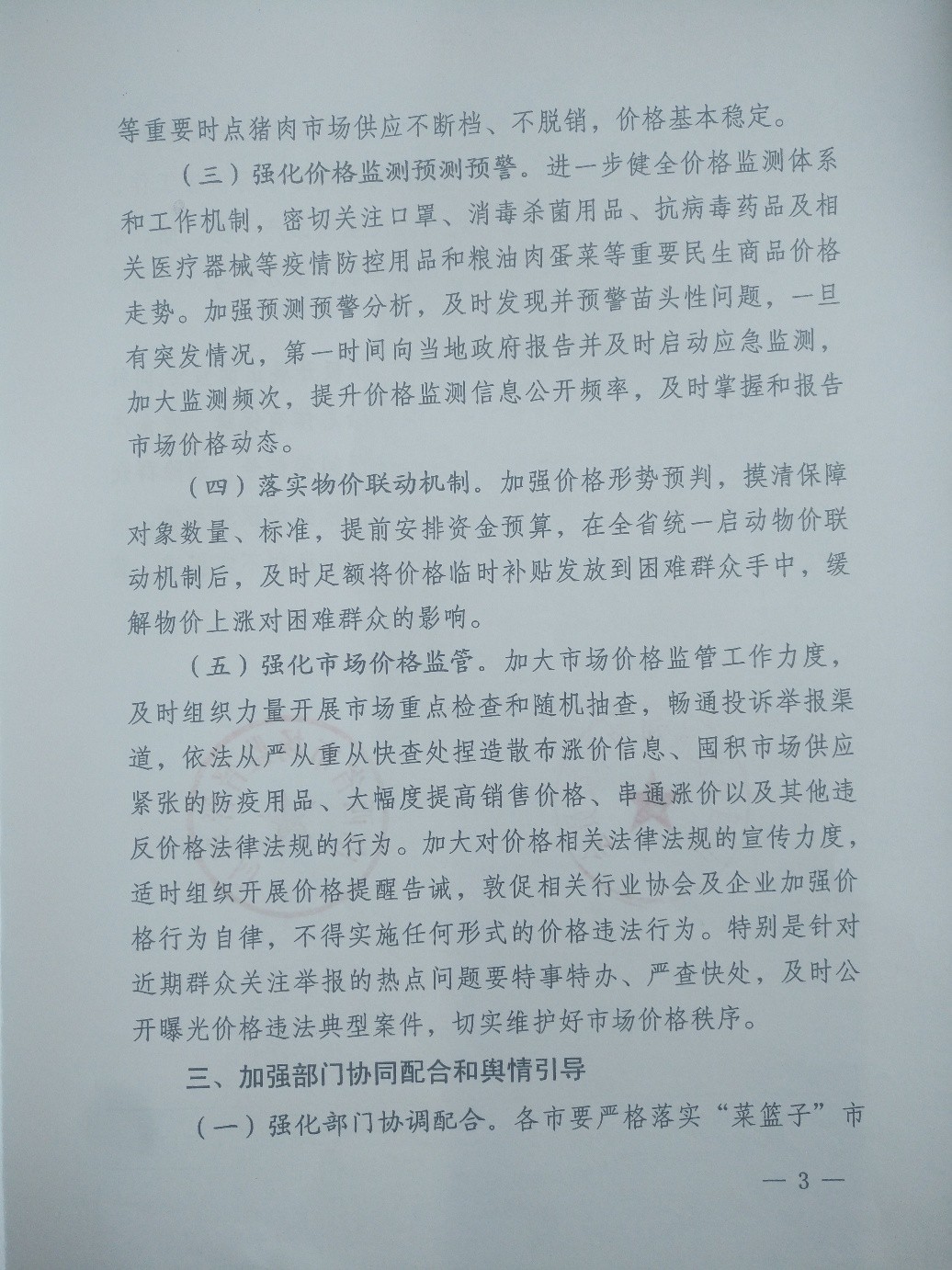 10.加强价格监管。严厉打击哄抬价格、囤积居奇等价格违法行为,加强对口罩等防控物资销售环节以及生产设备、原辅材料供应、生产经营全链条价格监管,做好主要商品价格采集分析,及时公布典型案例,维护市场价格秩序。